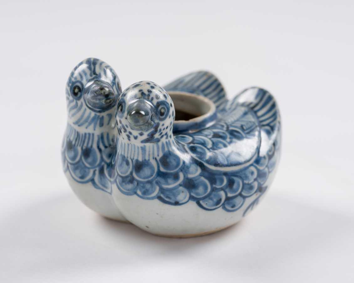 At the time they were created, the blue-and-white porcelain on view were available to any customer with the means to afford them. Most were mass-produced while a few examples were special orders. Some of the earliest known examples of cobalt oxide decorated ceramics were recovered from the wreck of a West Asian ship carrying Chinese goods from China to Iraq or Iran around the year 825. In about 1330, masterful Chinese potters at Jingdezhen painted cobalt oxide pigment on refined clay, which was then glazed and fired to create blue-and-white porcelain. It quickly became a highly coveted, widely imitated global commodity.