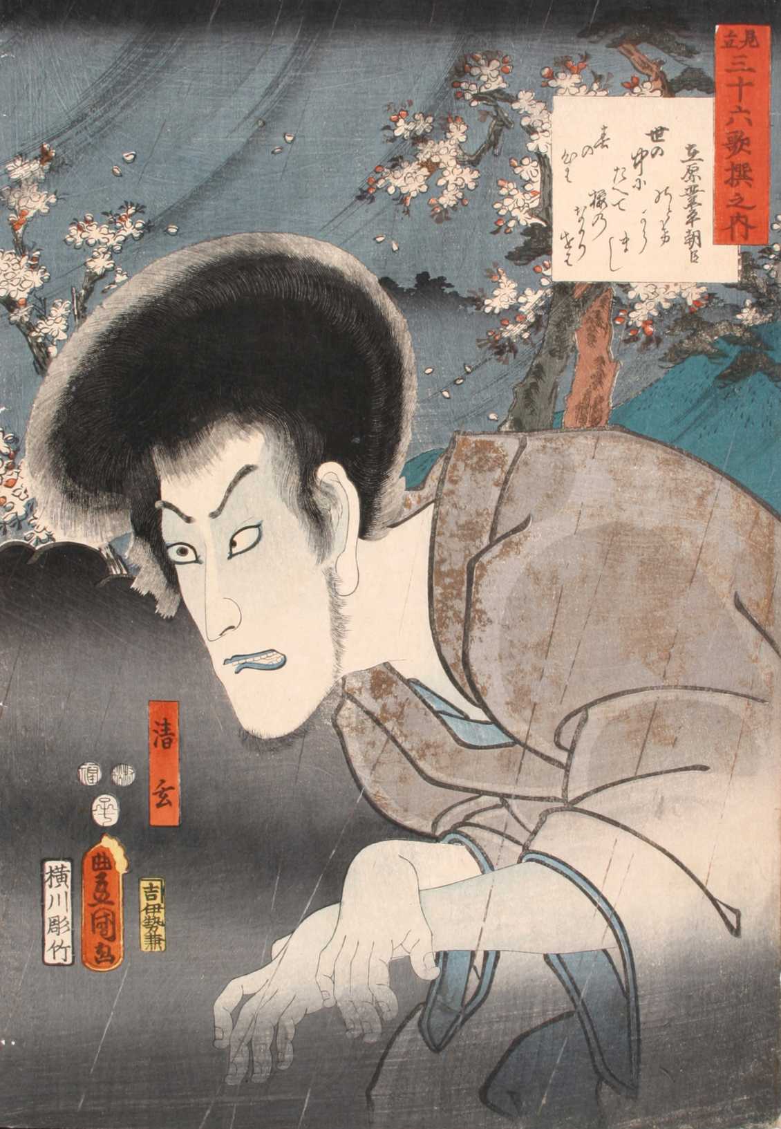 Utagawa Kunisada (Japanese, 1786-1864), Kabuki Actor Ichikawa Danjūurō VIII as the Ghost of Seigen with Poem by Ariwara no Narihira, 1852